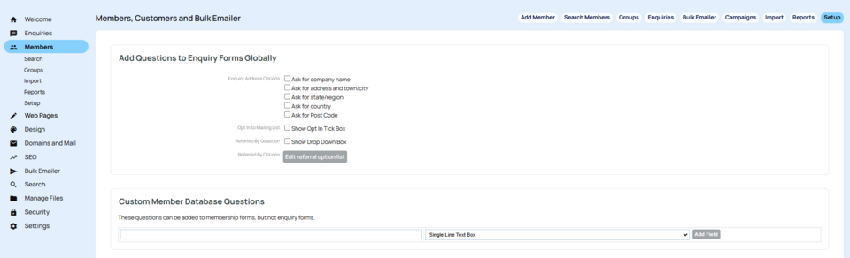 You can access these via the Members > Setup Tab > Add more demographics questions, opt in boxes & referral questions to all enquiry forms.